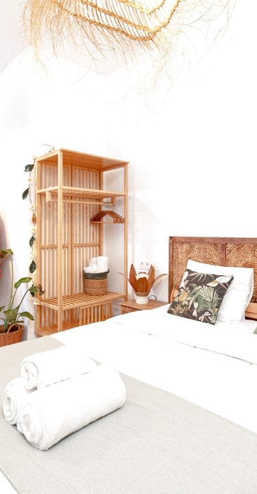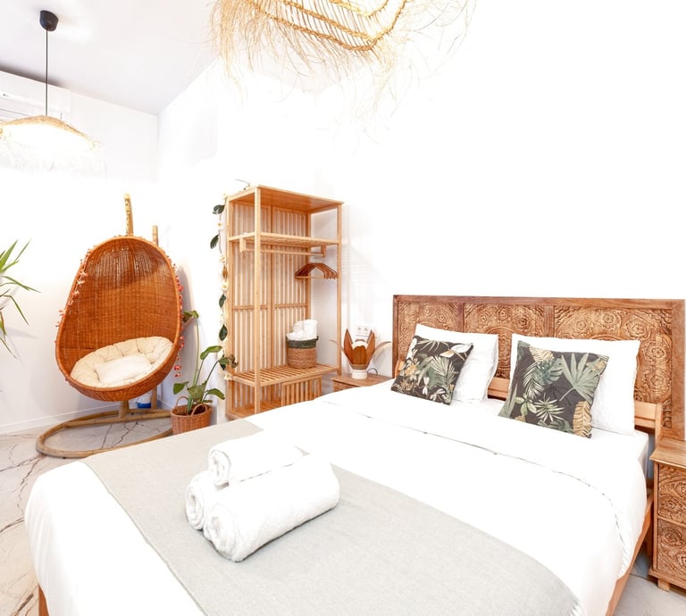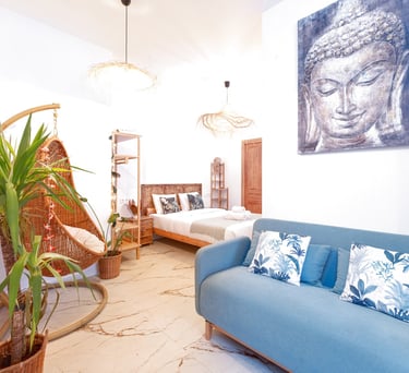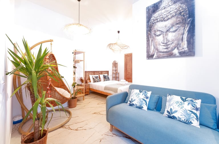 Transport yourself to the lush serenity of the Far East with Meet Me in Bali. Designed with handcrafted wood, rattan textures, leafy greens, and natural light, this apartment captures the soul-soothing essence of Balinese living — right in the middle of El Cabanyal. Kick off your shoes, breathe deeply, and let the space invite you to slow down. It’s a peaceful hideaway for mindful travelers who crave the exotic, without losing the comforts of home.